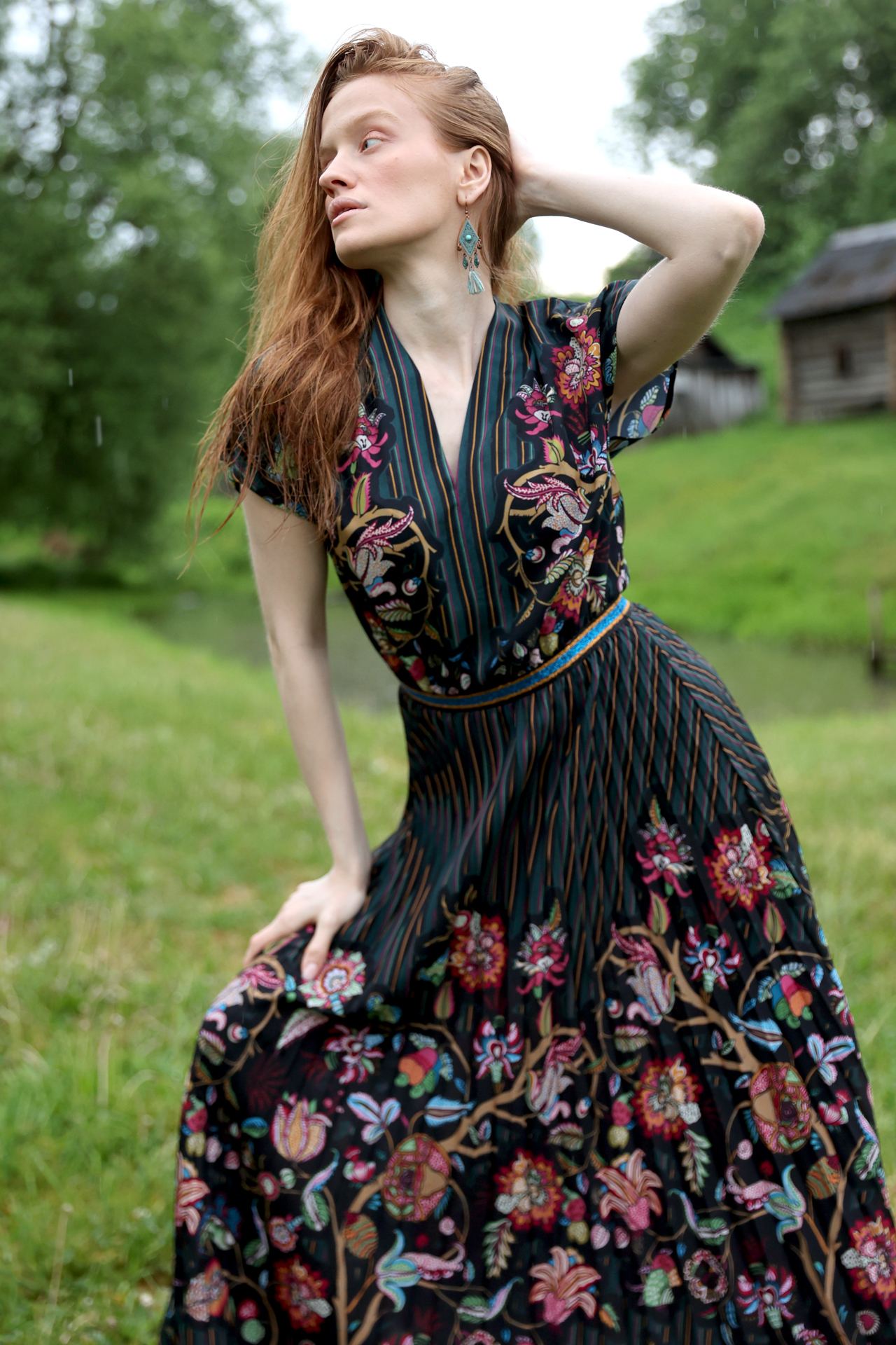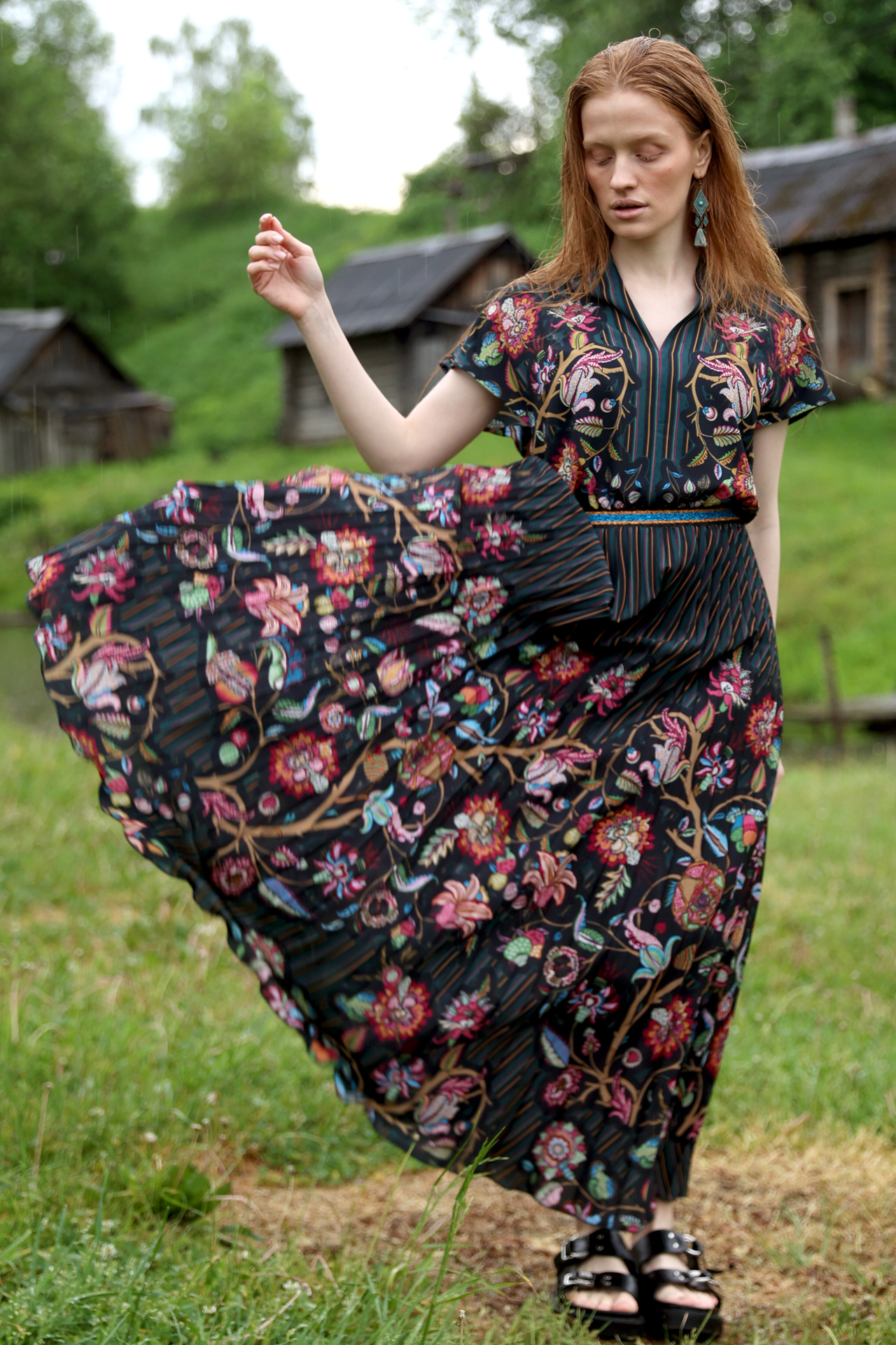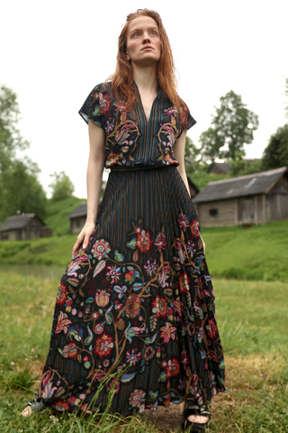 Платье «Эссе-25. Цветущий июнь» лёгкое и пластичное. Верх выполнен с V-образным вырезом, который визуально вытягивает силуэт. Приталенная линия талии переходит в длинную плиссированную юбку, благодаря чему платье красиво раскрывается в движении. Глубокий тёмный фон ткани подчёркивает насыщенный цветочный орнамент.