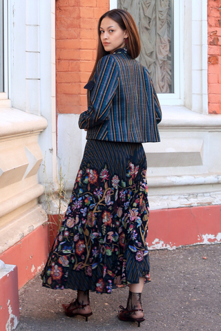 Этот комплект строится на контрасте графичной полоски и выразительного цветочного орнамента. Укороченный жакет и лёгкое платье соединяются общей палитрой и создают цельный, продуманный образ.