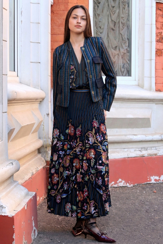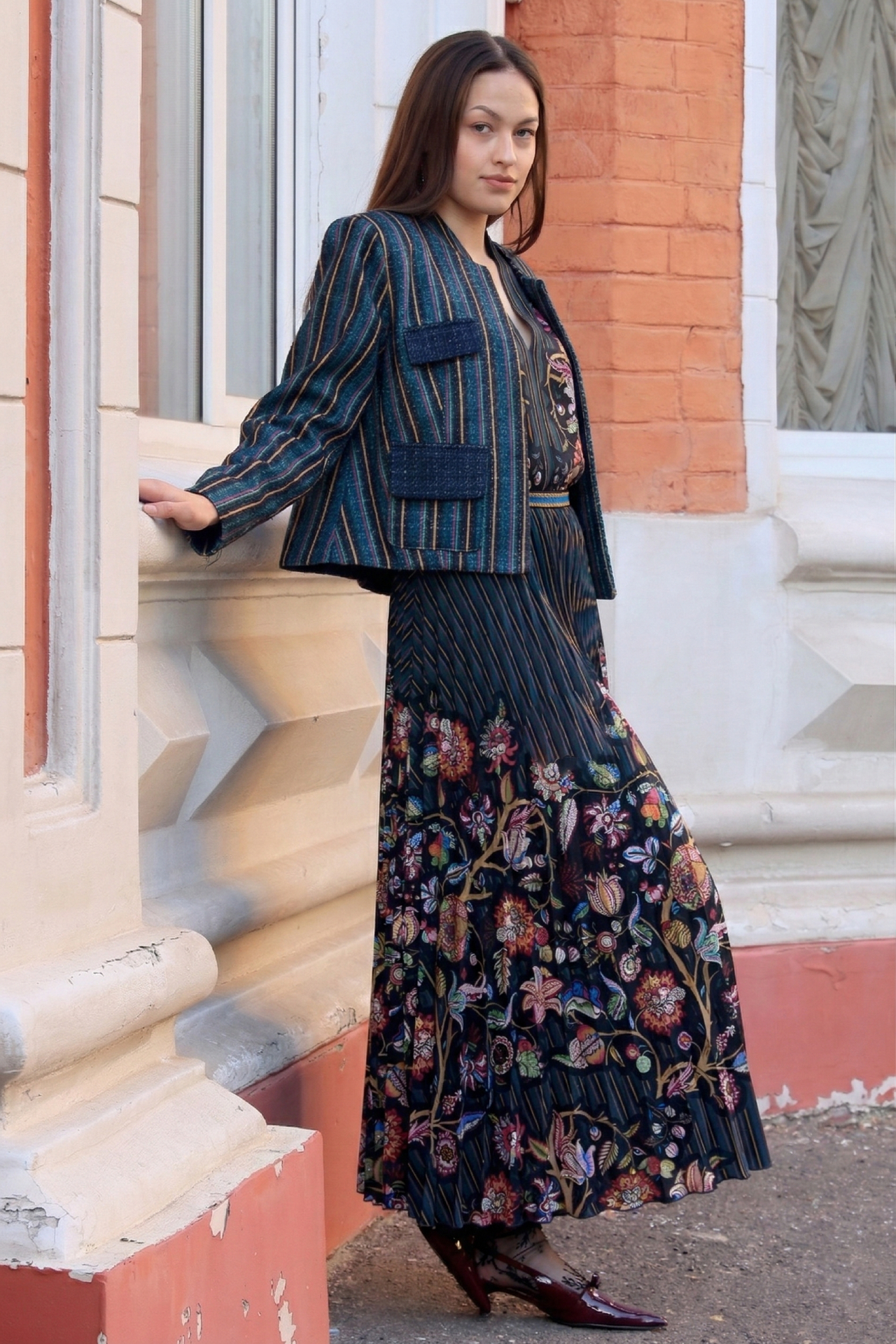 Плотная фактура жакета уравновешивает лёгкость платья и собирает силуэт. Плиссированная юбка добавляет образу движения, а сочетание полоски и цветочного рисунка делает комплект выразительным и гармоничным.