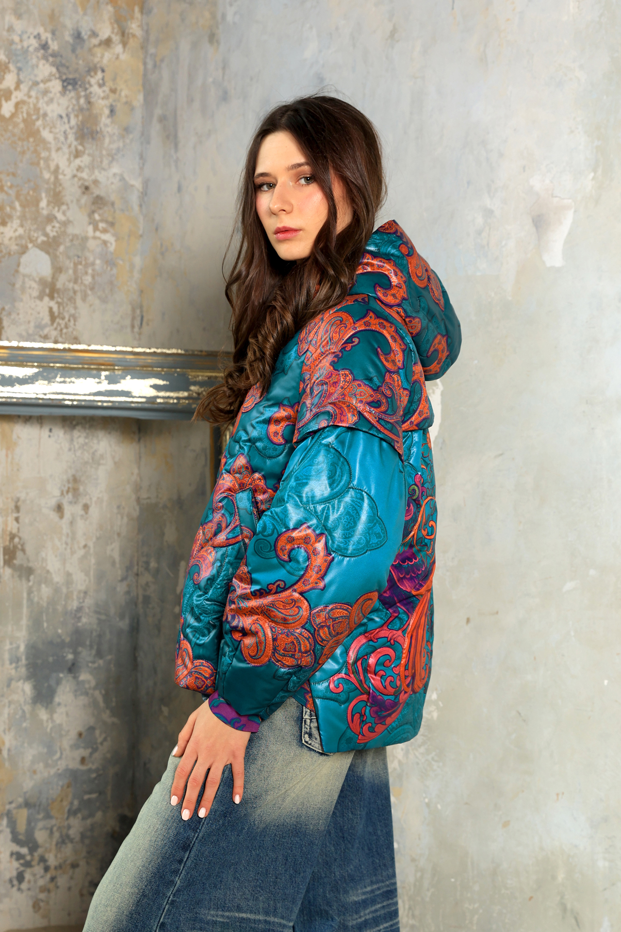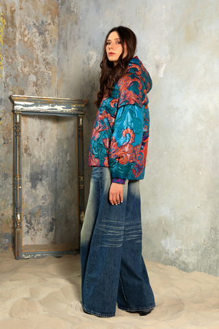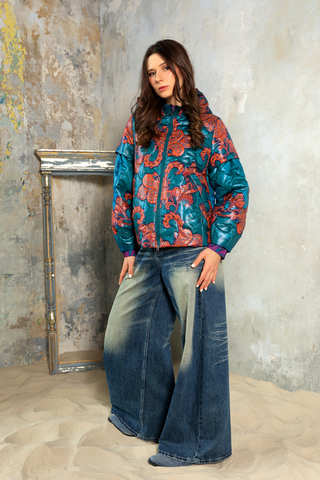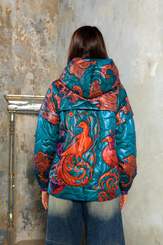 Куртка из капсулы «Искушение Востоком», коллекция «Садко» выполнена в насыщенной палитре: бирюзовый фон, оттенки оранжевого, красного и фуксии. Это одно из самых актуальных цветовых сочетаний сезона — яркое, плотное, визуально богатое. Принт «Заморские птицы» построен как цельная орнаментальная композиция: крупные мотивы, симметрия, ощущение ткани как декоративного полотна, а не фона.