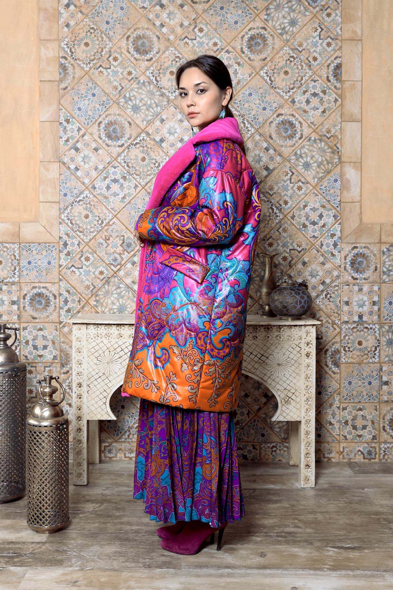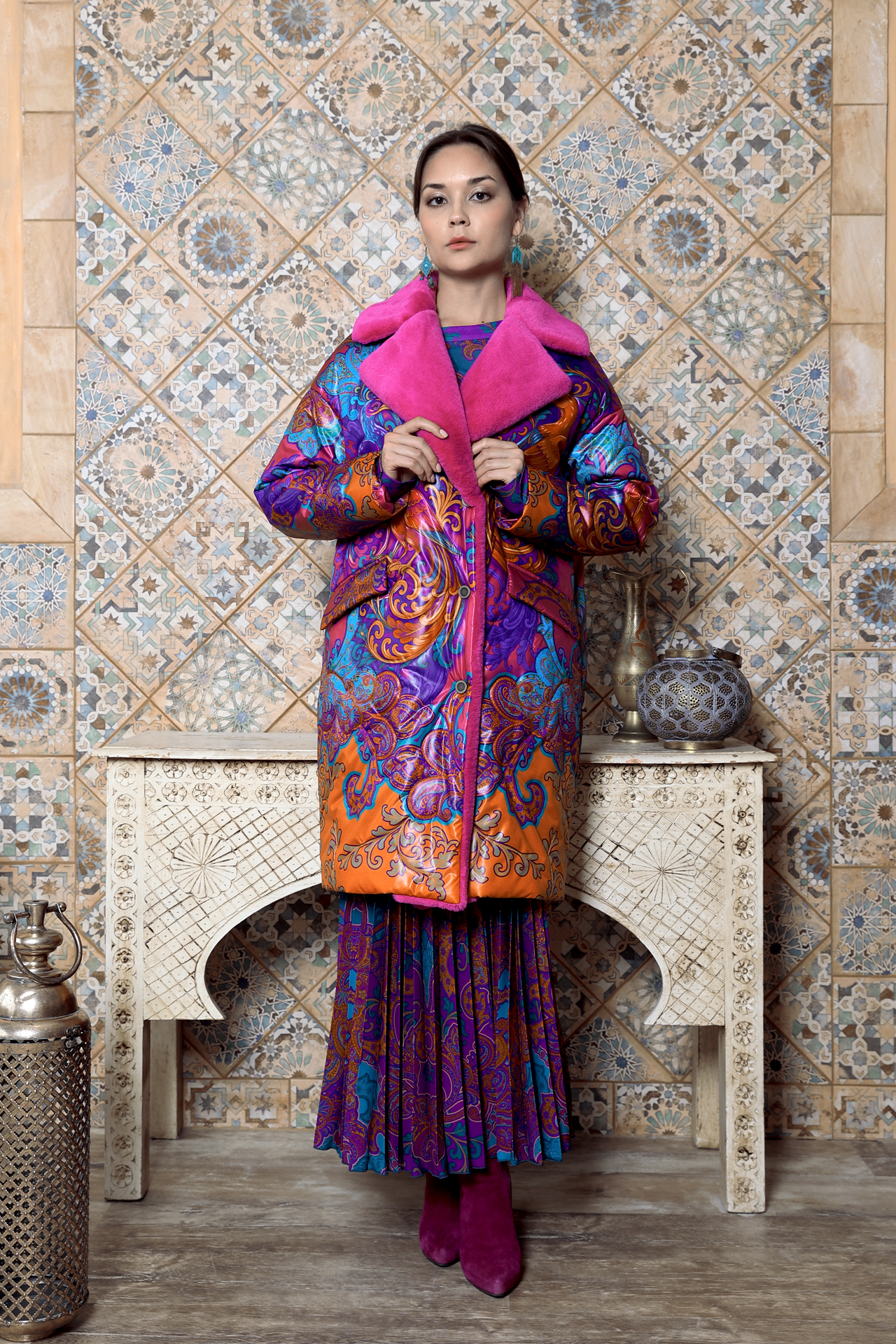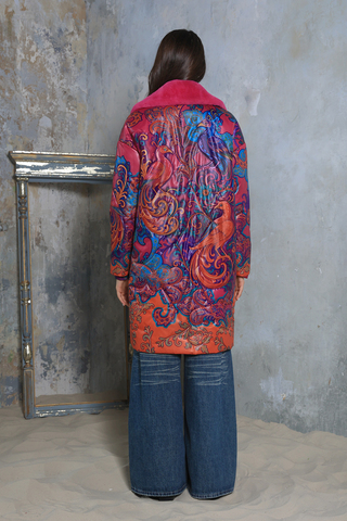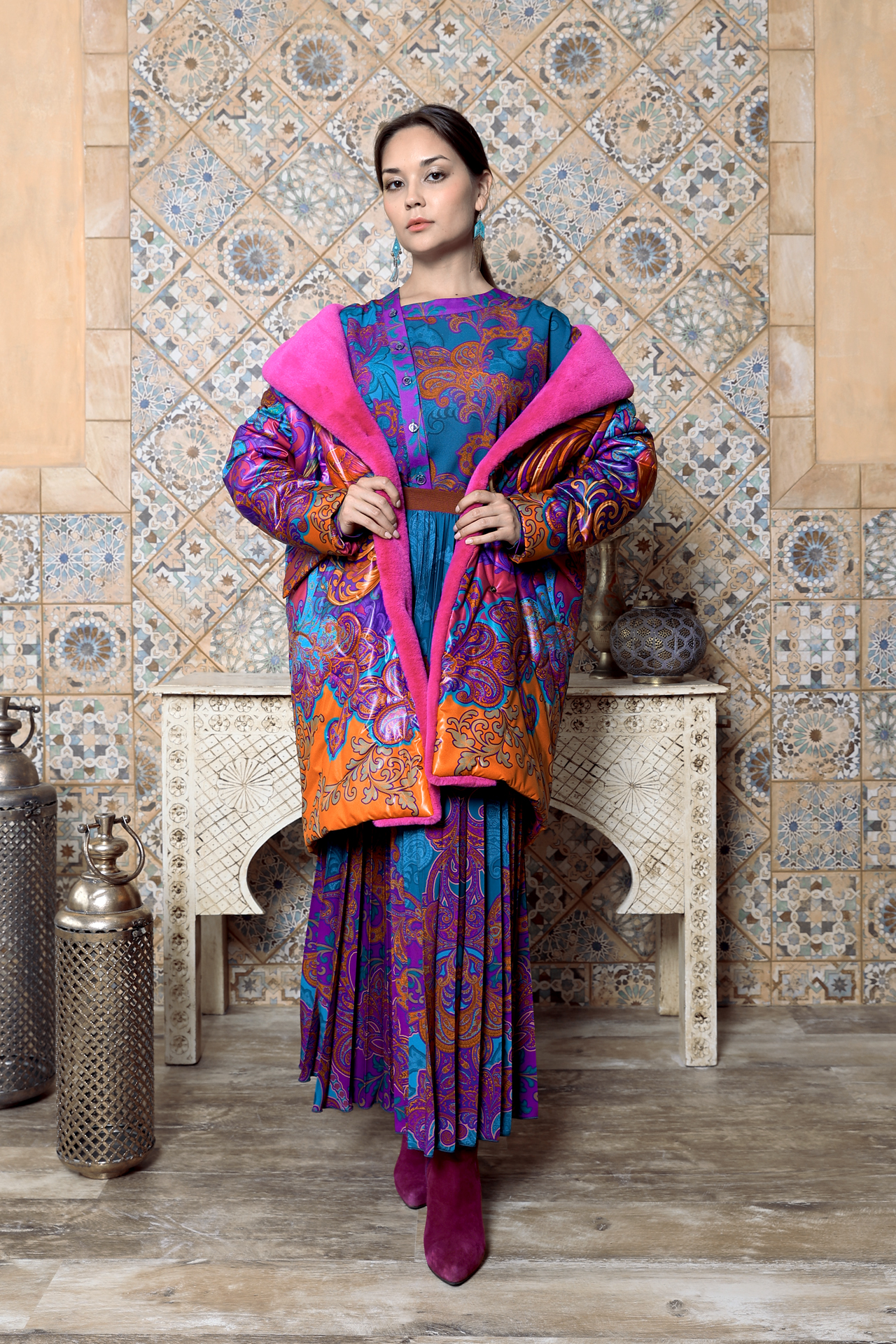 Насыщенный красно-оранжевый фон, сложный восточный орнамент с завитками и цветочными мотивами, контрастные сочетания фуксии и бирюзы. Принт распределён крупно и равномерно, создавая активную декоративную поверхность и задавая выразительный ритм всему силуэту.