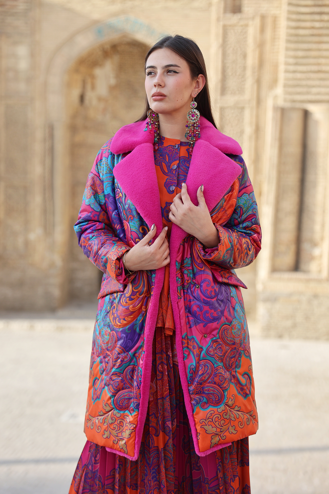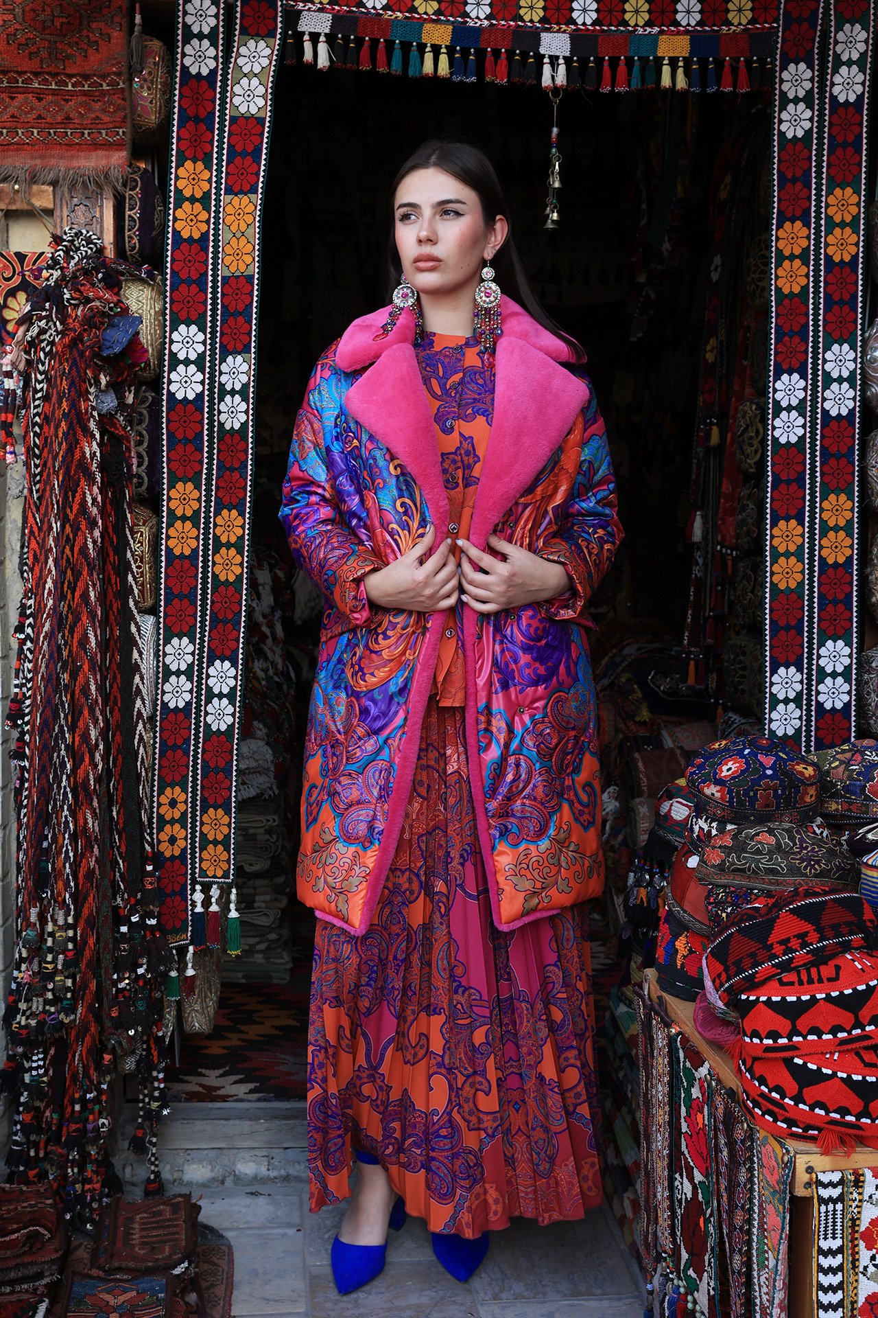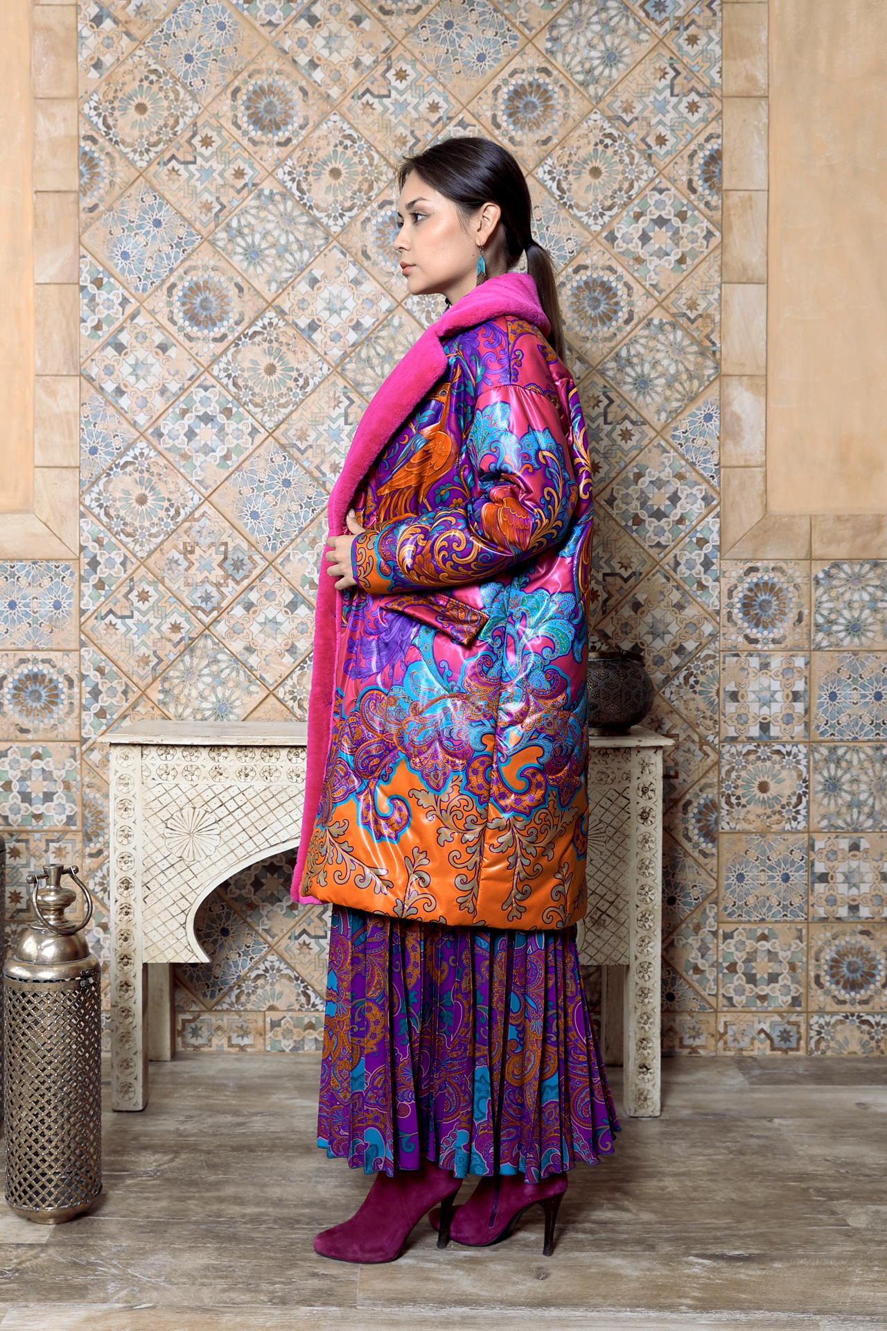 Насыщенный красно-оранжевый фон, сложный восточный орнамент с завитками и цветочными мотивами, контрастные сочетания фуксии и бирюзы. Принт распределён крупно и равномерно, создавая активную декоративную поверхность и задавая выразительный ритм всему силуэту.