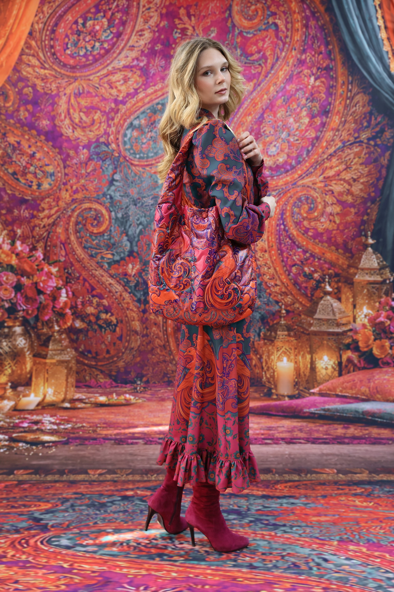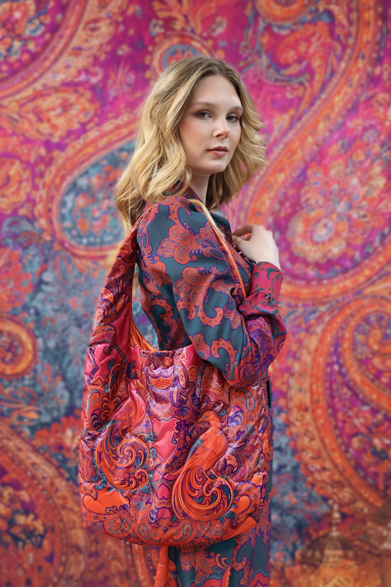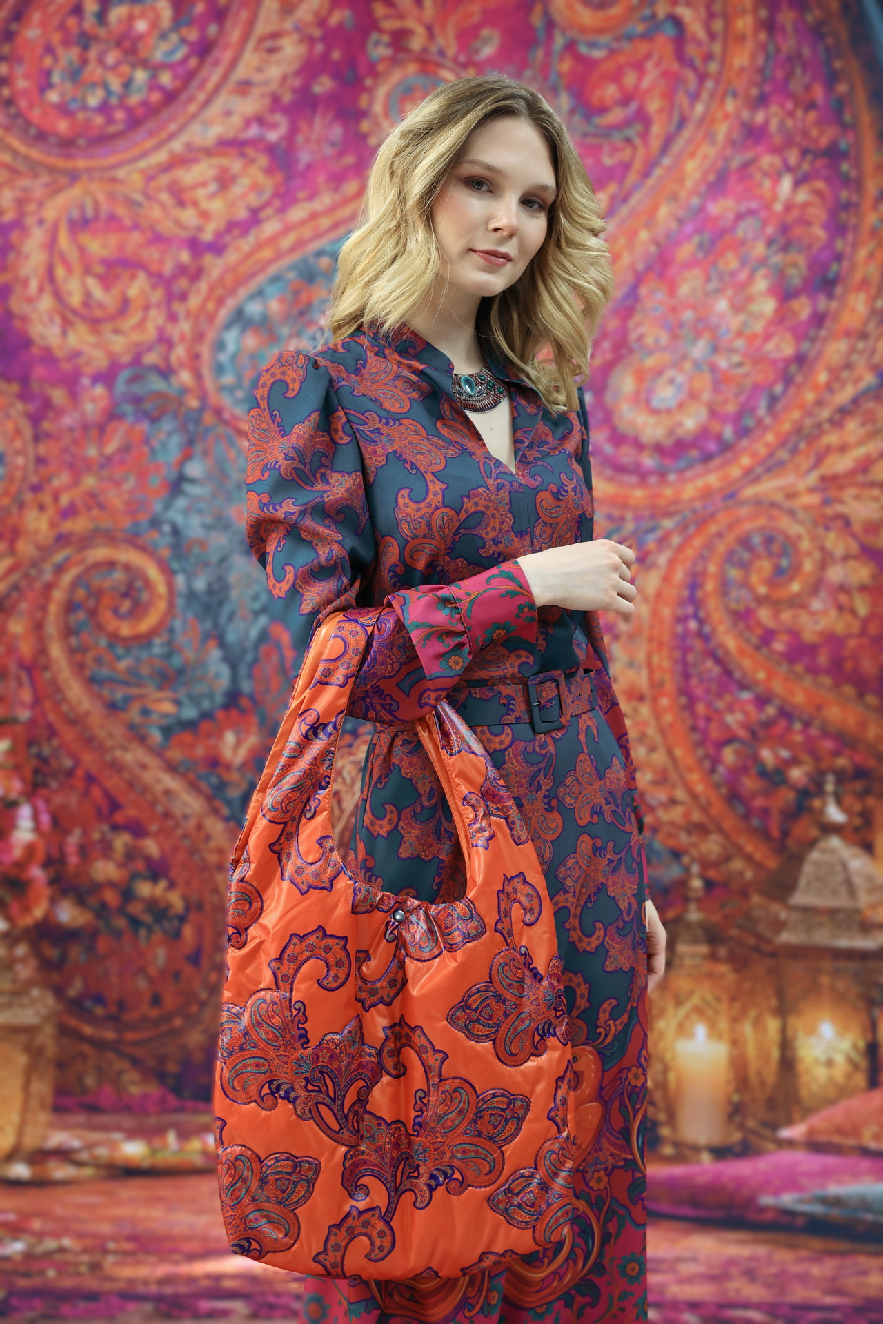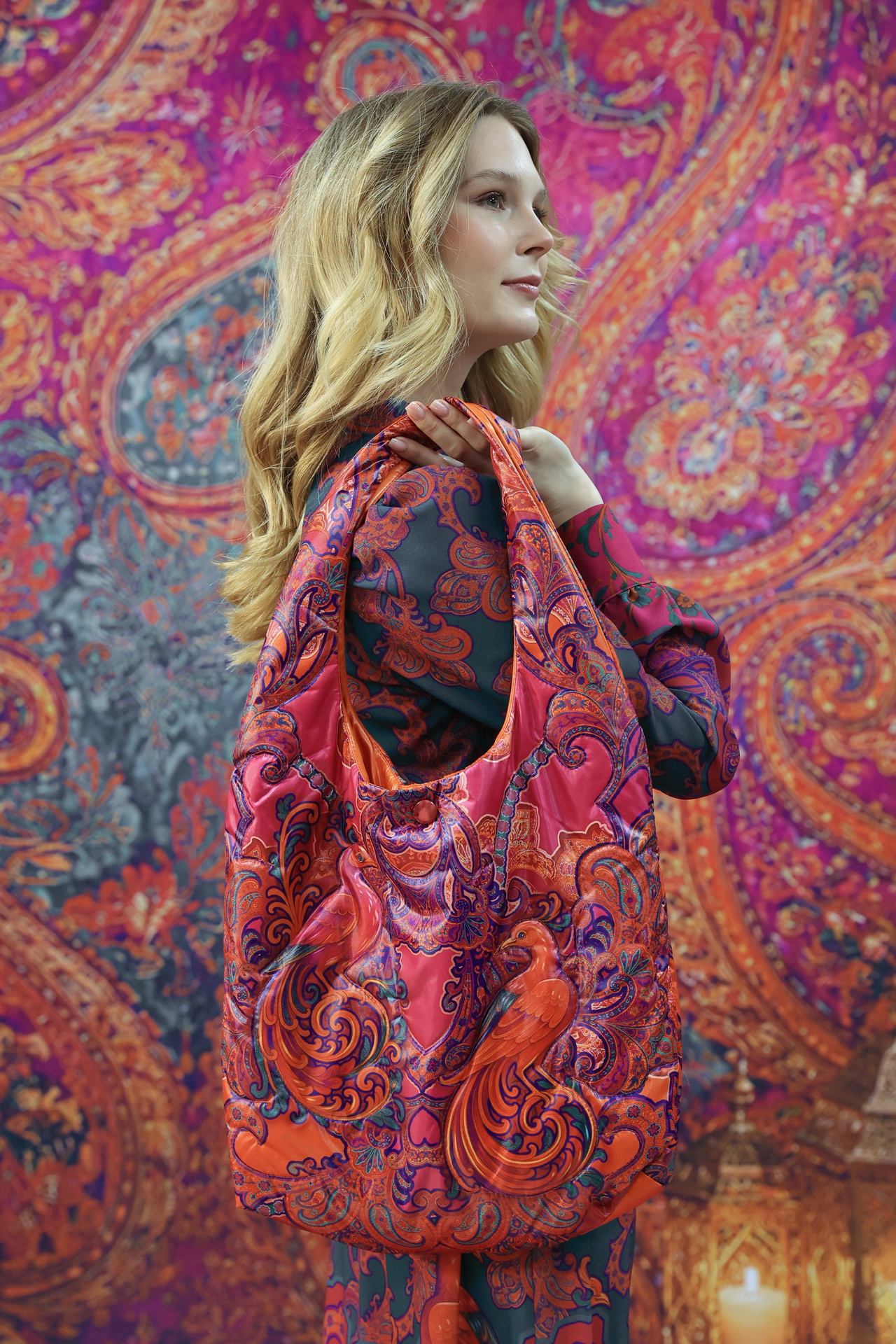 В комплекте с изделиями «Искушение Востоком» сумка логично завершает образ и поддерживает общую композицию.А в однотонном образе станет самостоятельным акцентом.